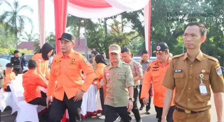 PALEMBANG. Wali Kota Lubuk Linggau, H Rachmat Hidayat menghadiri Apel dan Simulasi Kesiapsiagaan Kebakaran Hutan dan Lahan (Karhutla) Provinsi Sumatera Selatan tahun 2025 yang dipimpin langsung Menteri Lingkungan Hidup RI, Hanif Faisol Nurofiq di Halaman Griya Agung, Palembang, Selasa (29/7/2025).